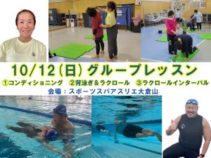 - 【グループレッスン】10/12(日)コンディショニング・背泳ぎ・インターバル歩くようにラクに泳ごう! ラクに泳ぐには、ラクに体を使うことが大事! 今回もスポーツスパ アスリエ大倉山さんで…