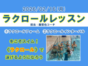 - 【平日夜】1/26(月)ラクロールレッスン by 森コーチ2026/1/26(月) アスリエ大倉山にて平日夜開催。 ラクロールでラクに泳ごう! ①ラクロールフォーム ②ラクロールインターバル