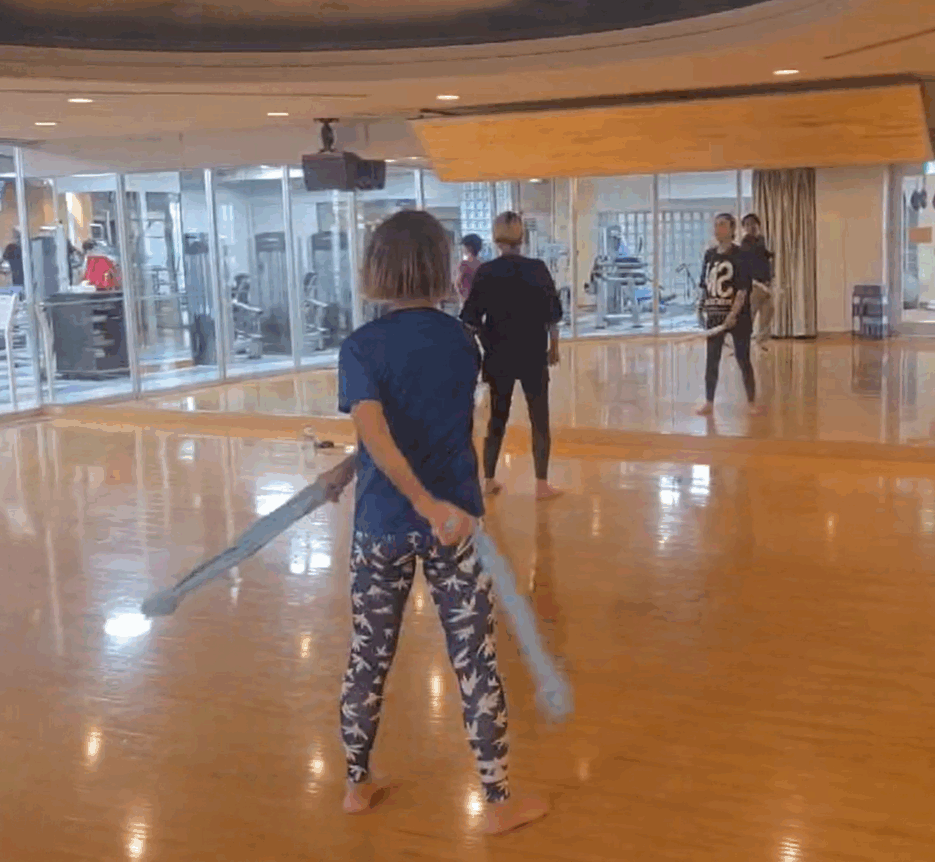 ↑タオルを使って、胴体を沢山ひねって背骨を柔らかく動かします